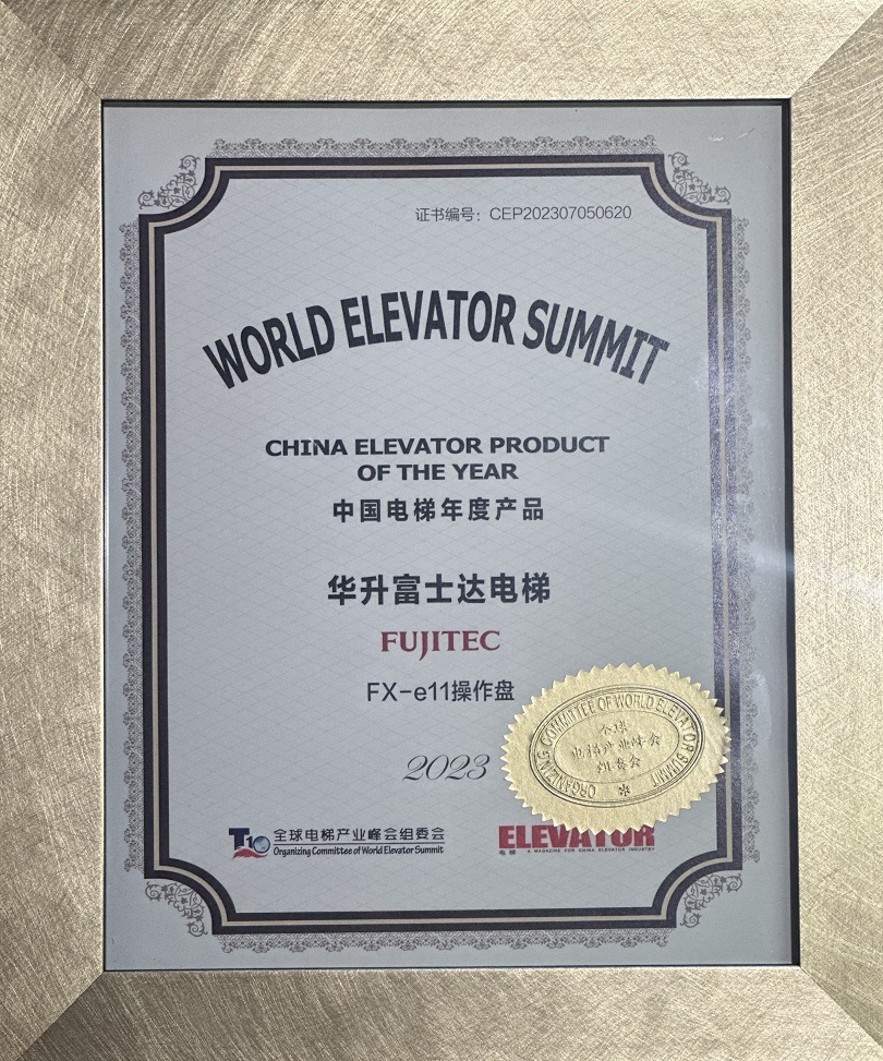 展览期间,“2023全球电梯产业峰会”发布了“2023全球电梯制造商10强”榜单,富士达电梯连续第十年入选,该榜单根据各整梯厂家经营规模、利润水平、国际化指数、技术和服务创新力、质量稳定性、品牌知名度等指标综合评定得出。华升富士达公司全新推出的高分辨率FX-e11全触摸操作盘入选“2023中国电梯年度产品”。